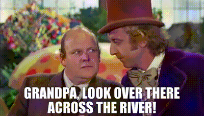 할아버지 강 건너편에 있는(손가락을 가리키는 방향으로 일직선으로 가로질러) 저기를 보세요(시선이 포물선 모양으로 건너감)