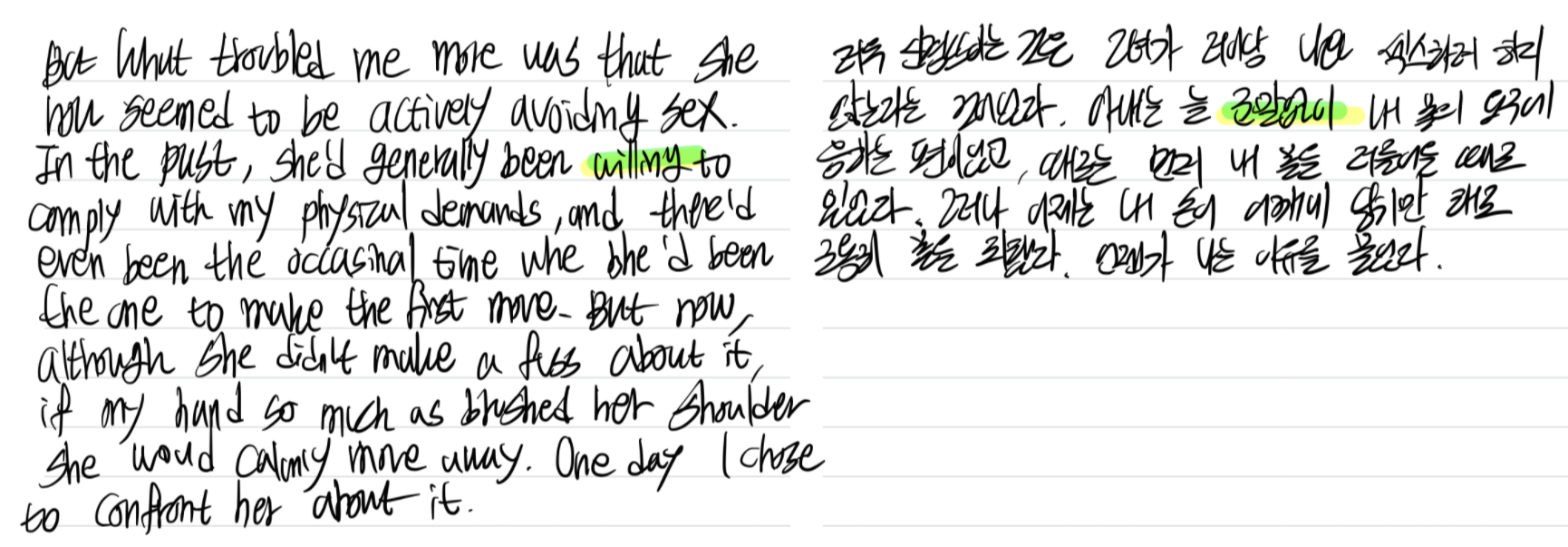'Willing'의 사전적 의미는 다들 아시는 것처럼 '기꺼이 하는', '자발적인'이라는 뜻을 가지고 있습니다. '군말 없이'는 '하지 않아도 좋을 쓸데없는 군더더기 말'을 의미합니다.
