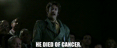그는 암이라는 직접적인 원인으로 죽었음을 나타냅니다.