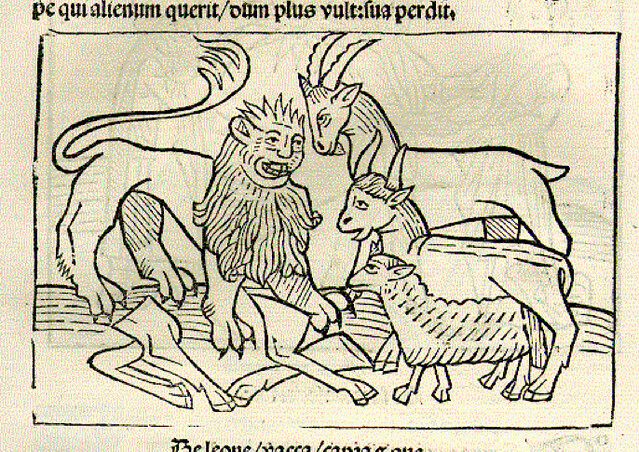 소와 염소, 양이 사자와 함께 사냥을 합니다. 네 덩이의 전리품을 나눌 때, 사자는 "내가 왕으로 부름 받았으니 첫 번째 덩이는 내가 가져가고, 두 번째 덩이는 내가 당신의 파트너이기 때문에 내가 가져가고, 세 번째 덩이는 내가 가장 강하니 내가 가져가고, 네 번째 덩이를 만지는 사람은 각오해야 할 거야"라고 말합니다.