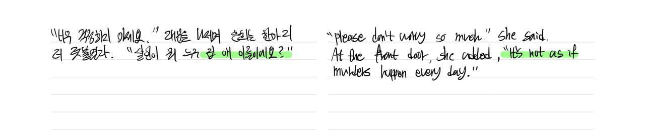 "너무 걱정하지 마세요." 대문은 나서며 은희는 한마디 더 덧붙였다. "살인이 뭐 누구 집 애 이름이에요?"