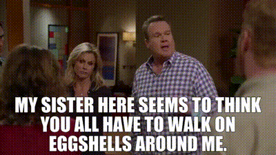 ▷ My sister here seems to think you all have to walk on eggshells around me.
