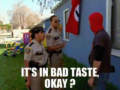 ▷ You can't have a nazi flag. It's in bad taste, okay?