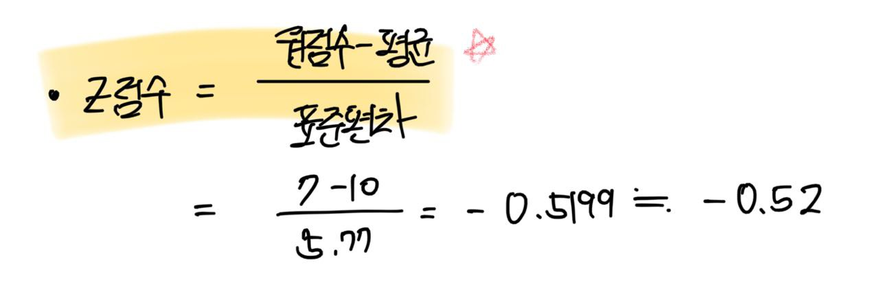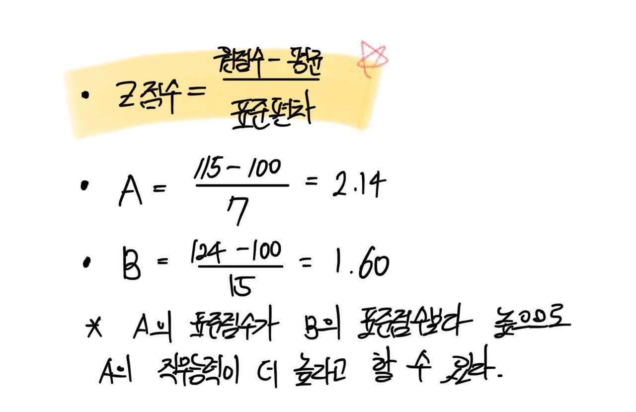 1) 점수분포의 표준편차를 이용하여 개인의 점수가 평균으로부터 떨어져 있는 거리를 표시한 것이다.