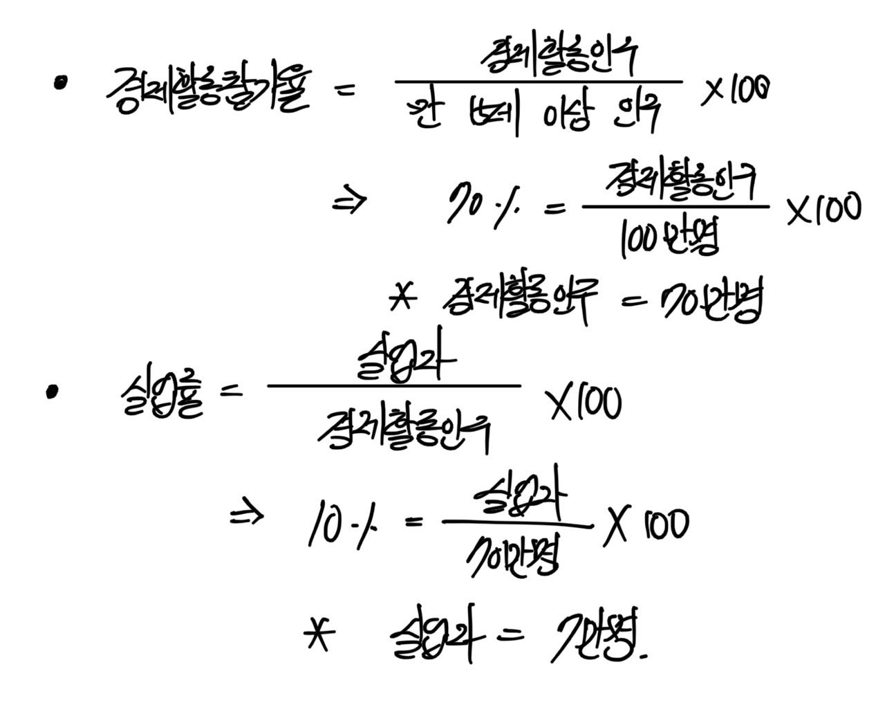 02 A국의 만 15세 이상 인구가 100만명이고 경제활동참가율이 70%, 실업률이 10%라고 할 때, A국의 실업자 수를 계산하시오(★★★★)