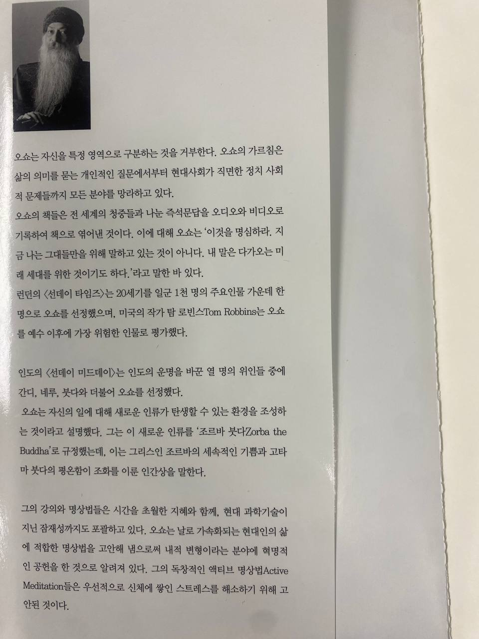 이전에는 명상을 나의 목표를 달성하고 더 나은 사람이 되기 위한 자기계발의 하나로만 봐왔다. 목표에 부합하는 건설적인 행동은 받아들이고 그에 반하는 충동적인 행동을 다스리기 위한 방편으로 명상을 해오는 식이었다. 하지만 이건 명상이 아니라 '집중'에 가까웠다. 오쇼의 말대로라면 사회가 '어떤' 사람이 되도록 노력하게 만든 이상향, 즉 가짜 자아를 쫓는 행위 었다. 나의 패턴화된 삶도 마찬가지로 타인의 인정과 존경을 받고자 '어떤' 사람이 되기 위한 발버둥에서 비롯됐다. 그렇다 보니 항상 과거에 대한 후회와 미래에 대한 걱정으로 현존하는 삶과는 아주 먼 삶을 살아왔다.