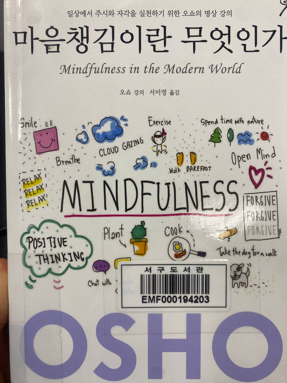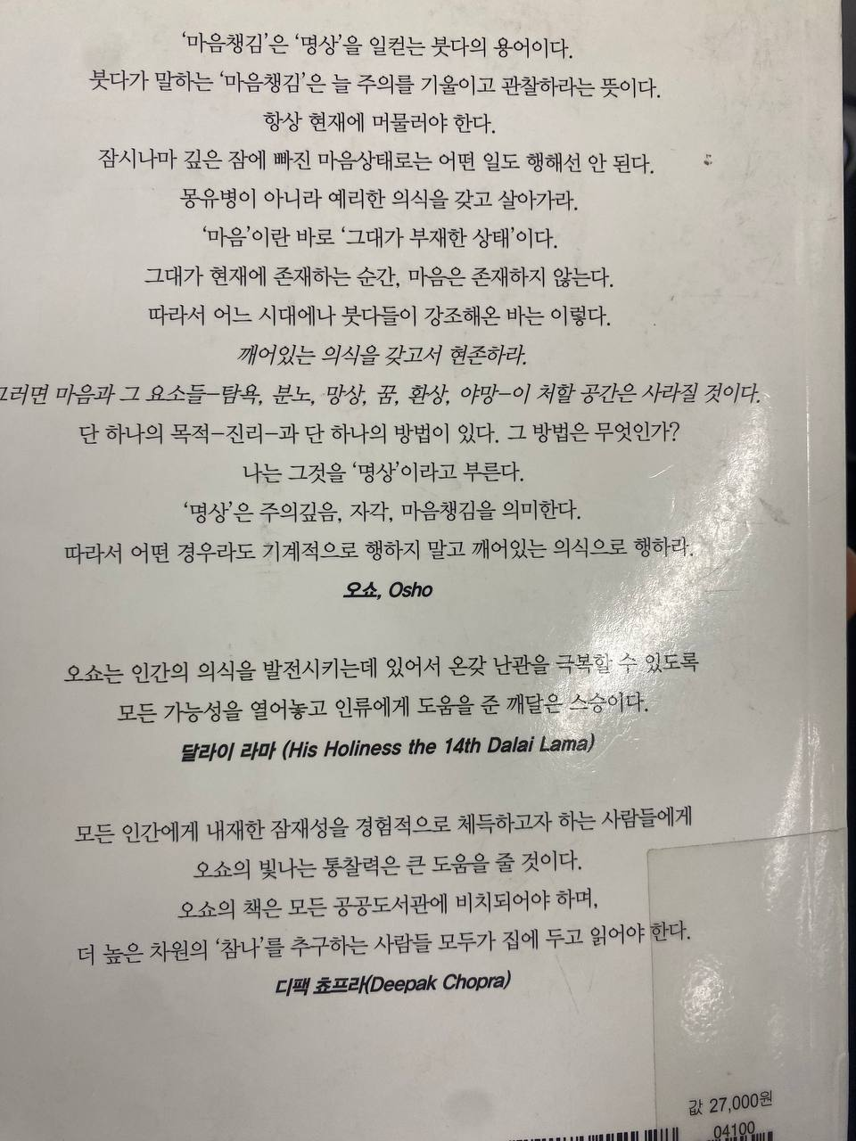 자아 초월에 대한 개념에 관심이 생겨서 오쇼의 자아초월을 접하게 되었고 책 내용에 감명을 받아 오쇼의 다른 책인 '마음챙김이란 무엇인가'도 읽어봤다. 일상에서 주시와 자각을 실현하기 위한 오쇼의 명상 강의라 하니 나의 고민에 대한 해답이 들어 있을 것만 같았다.